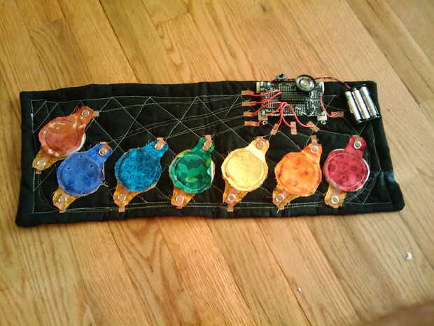 Lo que estoy buscando para a es construir un generador de sonido muy simple para que estos niños pudieran jugar la misma altura que el desempeñado por los estudiantes en sus grabadoras. Sería sólo unos pocos campos. Pensé que podría colocar algún tipo de pequeño botón en el fondo de sus círculos redondos para que cuando pulse en ellos el sonido saldría de un pequeño Altavoz, ruidosamente bastante por lo que podía oír.