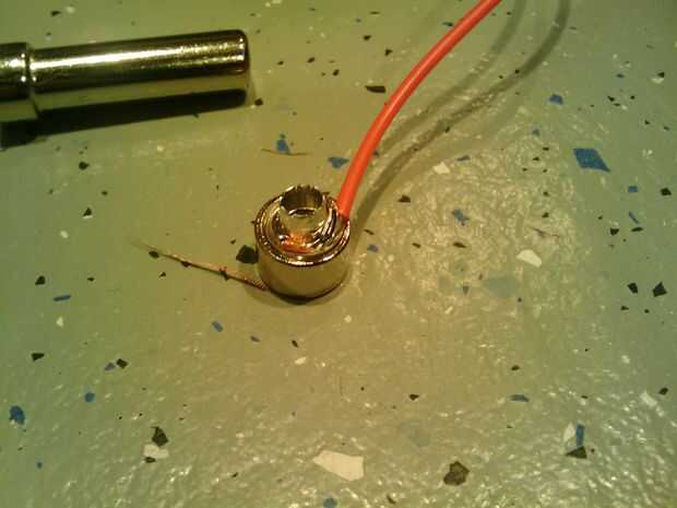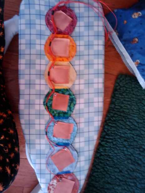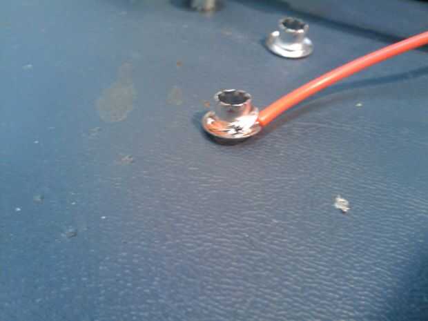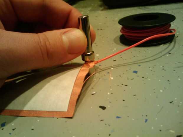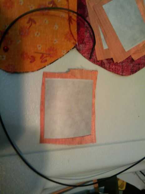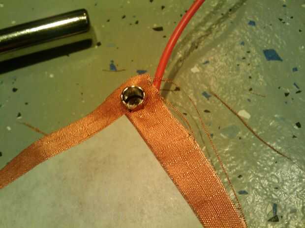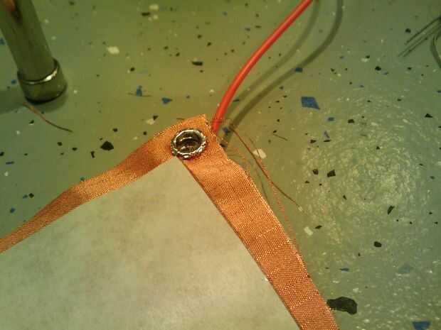 Una vez que la parte superior de los botones está cosida, cortar cuadrados de tela conductora y un lado del fusible. Corte el alambre a la longitud y uno de los extremos de la tira. Suelde el cable alrededor de uno de los ojales. (la soldadura no es probable que le pegan al ojete) Cortar un smallslit en la tela en una esquina y un martillo el ojal para sujetar la tela y alambre. Retire el papel de la fusión y fundir al tejido conductor en la parte posterior de la tela coloreada. Repita para todos los interruptores. Para facilitar las cosas, usted puede calentar tubo del encogimiento de los cables juntos cuando un cable pasa el hilo para el interruptor próximo.