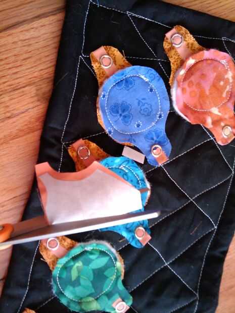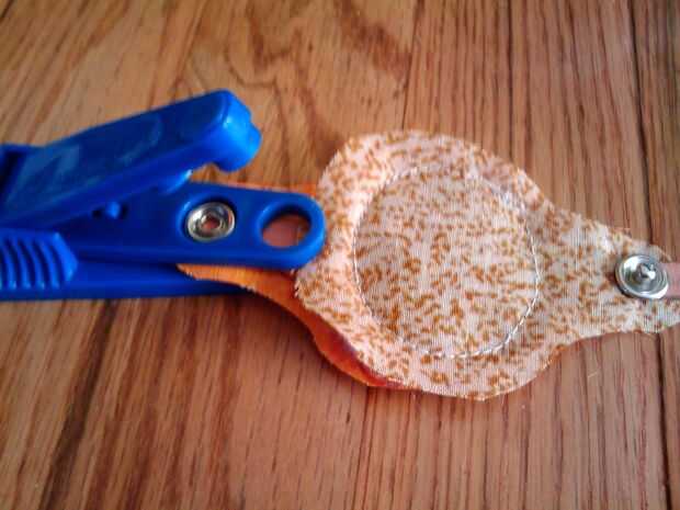 A su máquina de coser y puesto de bateo con agujeros entre la tela de la parte superior e inferior. Cosa fuera de la tela conductora y saltar sobre la parte de "stick" del interruptor. Encontré que es posible coser a la tela conductora superior a la parte inferior creando un cortocircuito. Es mejor no coser a través del tejido conductor. Colocar broches de presión y el interruptor se hace. Me pareció más fácil de usar el complemento masculino para todas las conexiones de la parte inferior/GND y el complemento femenino para todas las tapas. Esto hace que todos los interruptores intercambiables.