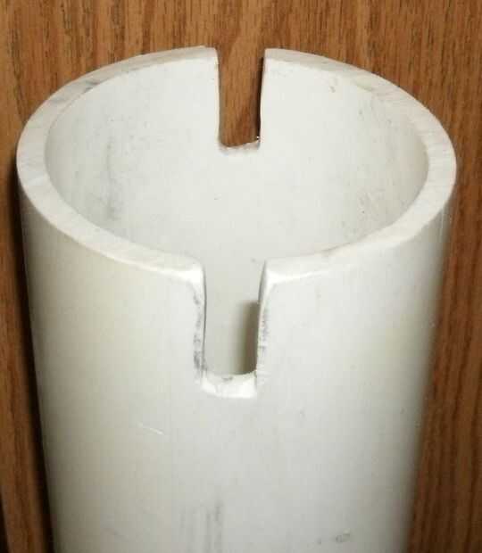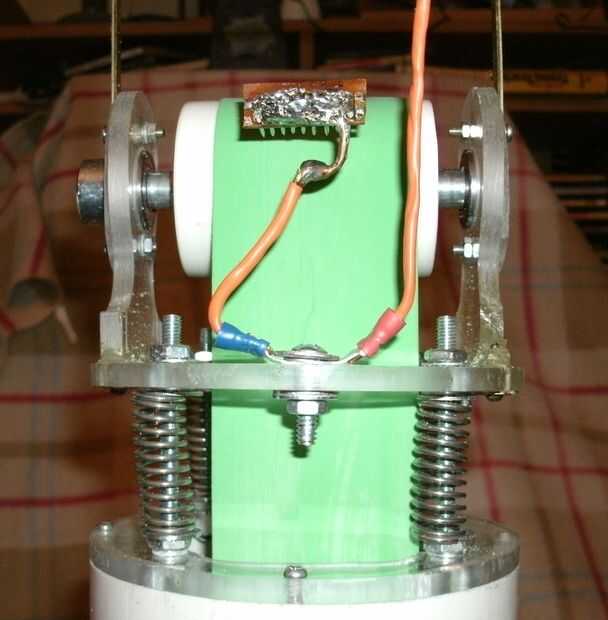 Si optas por instalar el motor sobre una plataforma ajustable puede hacer ajustes allí o puedes hacer un conjunto de rodillo superior de resorte como lo he hecho para ajustar el tracking. O si quieres montar los rodamientos dentro del cubo simplemente puede cortar ranuras a lo largo de los lados de la columna de PVC (como en la última foto) y utilizar un eje roscado y fije el eje con tuercas de seguridad.