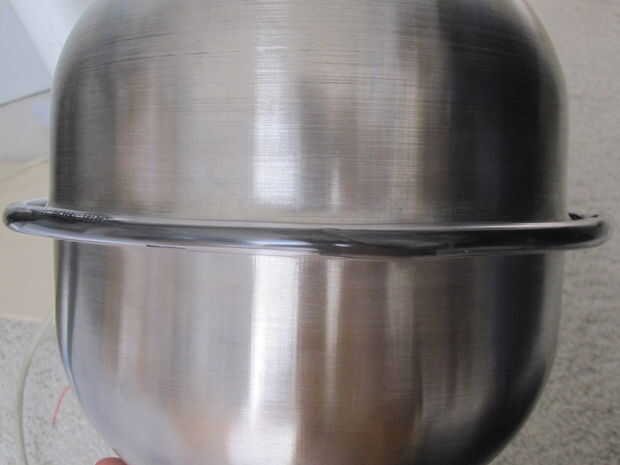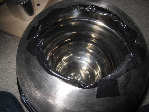 Este paso es bastante sencillo. Compré dos recipientes de mezcla de acero inoxidable (en blanco creo) que eran unos 8" de diámetro. Para obtener la esfera para caber sobre el cuerpo que tuve que cortar la parte inferior de uno de los tazones de fuente. Inicialmente perforé tan grande un agujero en uno de los tazones de fuente, y luego recortar la parte inferior usando varios pares diferentes de tijeras. Una vez que el agujero fue lo suficientemente grande como para permitir que el recipiente caber sobre el PVC y el rodillo superior (es importante que el rodillo superior está dentro de la esfera superior). Esta izquierda un montón de bordes afilados en el recipiente, por lo que cubrí el borde con cinta aislante que también puede utilizar tubería de vinilo fino dividido por la mitad para cubrir filos (esto es lo que hice con el borde de los tazones de fuente). La cinta aislante no es aislar, sino simplemente cubrir los bordes agudos y hacerlos más suaves (cinta eléctrica es conductor en estos voltajes). El siguiente paso fue reunir los tazones de fuente. Lo hice por colocarle los tazones de fuente superior de uno al otro para hacer una esfera y luego eléctrico encintado de como eso. He intentado hacer una abolladura en la parte superior de la esfera (abultamiento en la parte exterior) para permitir que un lugar para el alambre de percha a ajustar en la esfera para mantener estable. Tuvo éxito solamente parcialmente, pero todavía funcionaba bastante bien. Espero que en el futuro reemplazar a esta esfera con una esfera mirando jardín más grande y suave.