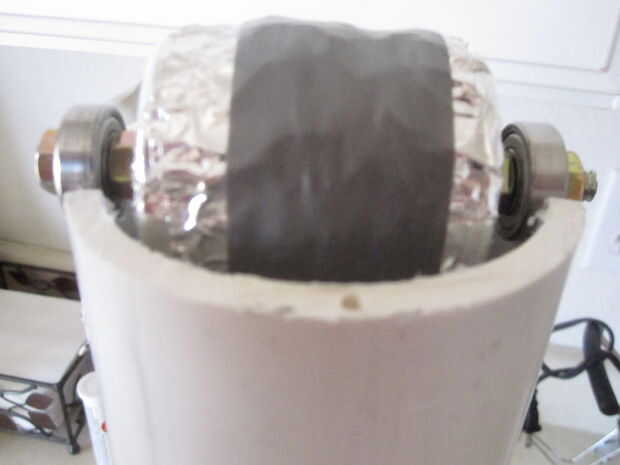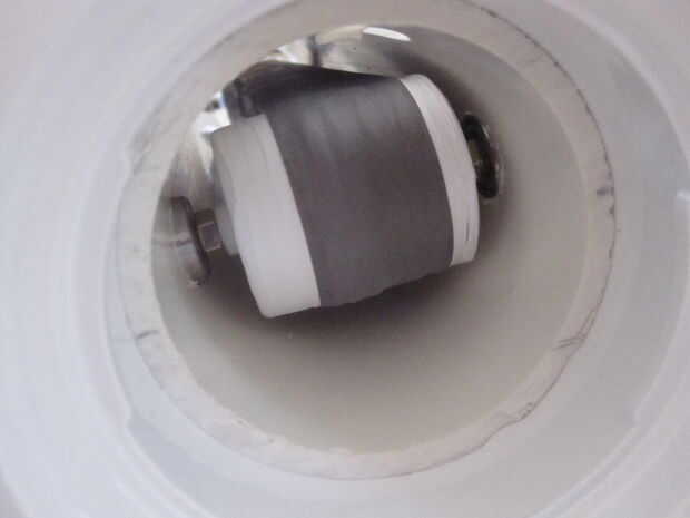 Lamentablemente, el rodillo inferior que armé anteriormente debían desarmarse para este paso, puesto que el rodillo era demasiado grande para caber a través del orificio inferior que perforé en el PVC. Aunque esto es probablemente una buena cosa, hace instalar la correa más difícil. Quité todas las tuercas y el cojinete de un lado y luego el rodillo sí mismo. Luego coloque la correa alrededor del rodillo y coloca un trozo de cuerda en el otro extremo de la correa. Coloca el cursor en el interior del tubo y luego poner la varilla roscada (que todavía tiene dos tuercas y un cojinete en él) a través de un agujero en el PVC y luego el rodillo. Puse una tuerca en el otro lado del rodillo, seguido por el rodamiento y otra tuerca. Colocar los rodamientos en sus respectivos agujeros en el PVC y luego añade un poco de pegamento caliente para no pasear (también puede usar algo como locktight, que puede romper el vínculo más adelante).