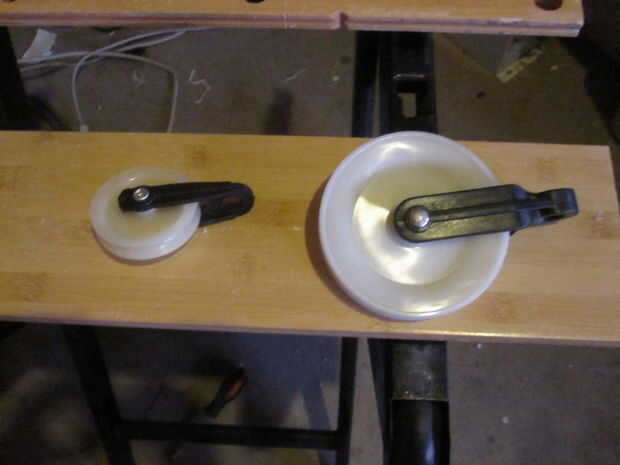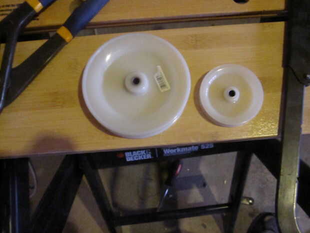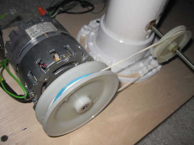 Tengo un exceso de motor de CA en una tienda de excedentes para menos de diez dólares. Tenía muy buen par, pero sólo 1800 RPM en vacio. He visto un montón de VDG donde el motor se acopla directamente al rodillo inferior, pero ya que mi motor era tan lento, que pensé que así podría tratar de hacer que vaya más rápido. Hacer esto poniendo una polea bastante grande en el eje del motor y una polea más pequeña en el rodillo inferior. Las dos poleas se une por una correa, y la proporción de las circunferencias determina cuánto la velocidad se acercó. Básicamente funciona igual como engranajes en una moto, grande del engranaje en los pedales y pequeños cambios en el medio de la rueda hay mayor velocidad pero requiere más esfuerzo de torsión.