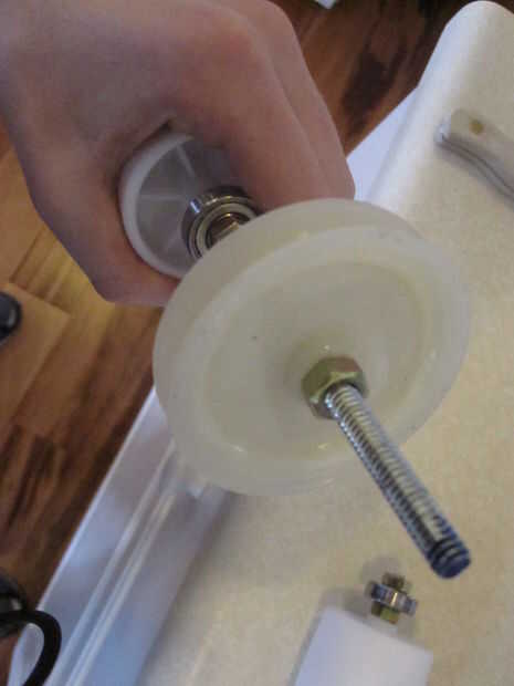 Para preparar las poleas que tuve que usar un hack Sierra para cortar otro perno que sostiene las poleas para su hardware de montaje principal, en casi exactamente la misma manera que tuve que cortar a través de la clavija en el rodillo de la cama en el paso 2. Una vez que las poleas estaban fuera, encontré el metal con la superficie de la polea pequeña era demasiado pequeño para el rodillo inferior, por lo que llevaba a cabo con un 1/4" de la broca en el taladro de mi. Luego lo pongo en la larga cantidad de la varilla roscada que sobresale en el rodillo inferior con una tuerca a cada lado de la polea.