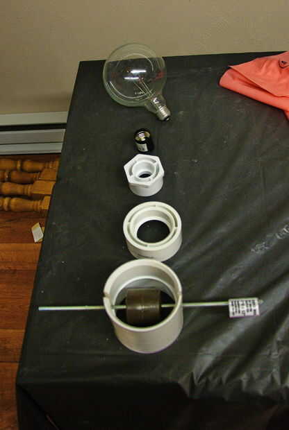 también adelante y montar las otras partes, el zócalo de la bombilla y el 1,50" adaptador y el adaptador de 2-3", bucles de alambre desnudo de cobre trenzado alrededor del solo tornillo izquierdo de instalar en la toma de luz, una vez colocada, snip abrir los lazos para hacer lotes de cerdas de cepillo de cobre, plegado/forma que simplemente se deslizan sobre la rueda/correa para recoger la carga estática y transferirlo a la toma / y eventualmente al bombilla/globo
