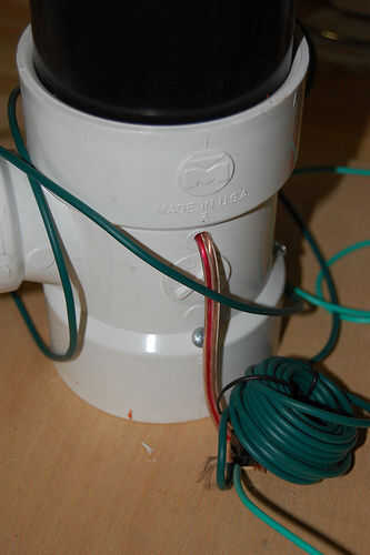 esto es un simple generador Van De Graaff.  Se utilizó un pedazo de 6 pulgadas de tubo plástico de 30 pulgadas de largo; un motor de ventilador oscilante atornillados directamente al fondo de la pipa que tenía un buen eje largo donde un rodillo de la