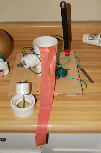 IntroAquí es un electrostático que motor' s fácilmente construido para un proyecto de Ciencias. El rotor fue construido por laminar una tira de papel de aluminio entre capas de cinta de embalaje plástico y rodando en un tubo. El tubo fue montado en u