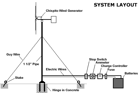 Uso de generador de viento de Chispito - necesita una torre, alambre, amperímetro, controlador/regulador de carga y un banco de baterías para su aerogenerador de Chispito. Consulte http://www.velacreations.com/chispito.html para obtener más información