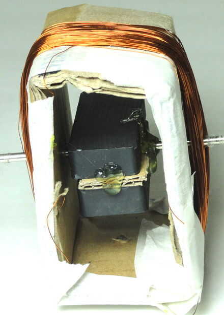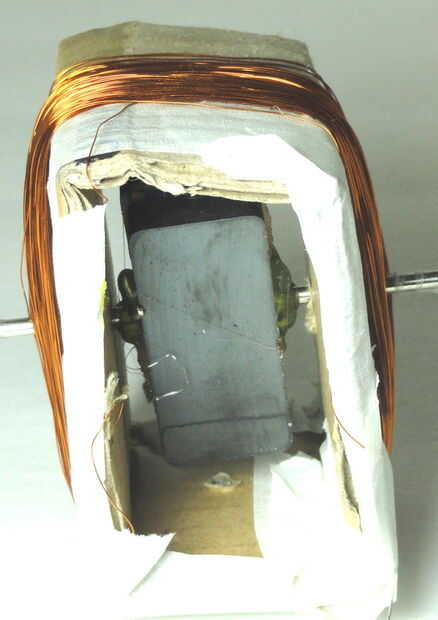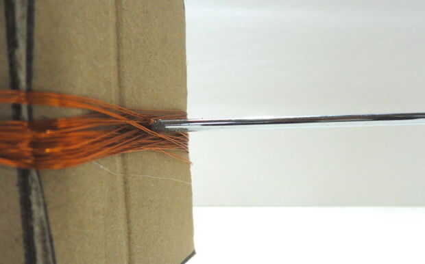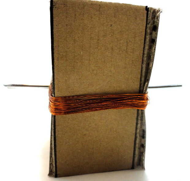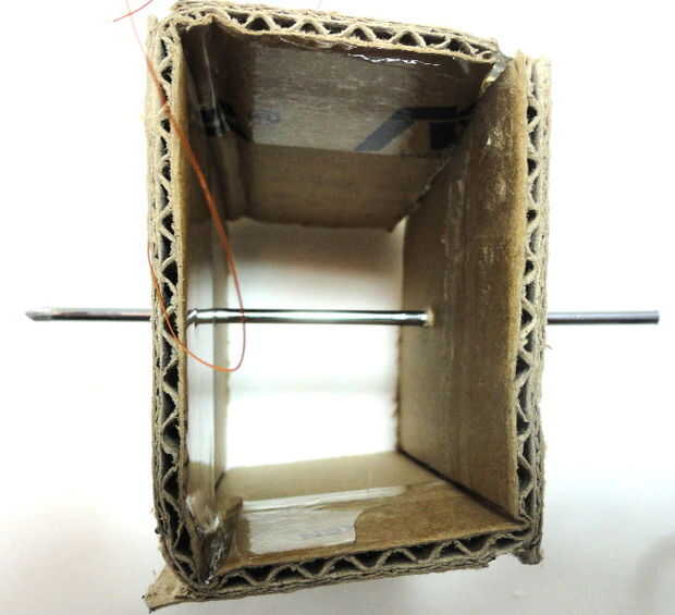 Tomar la varilla de metal y con el extremo afilado colóquelo en el centro el alambre de cobre y en el centro de la cartulina. Este paso es muy importante y puede requerir que vuelva a insertar la varilla si no está en un buen lugar. La razón por que esto es importante es que los imanes se unirá a la barra y cuando gira se gire suavemente sin golpear los lados o extremos.