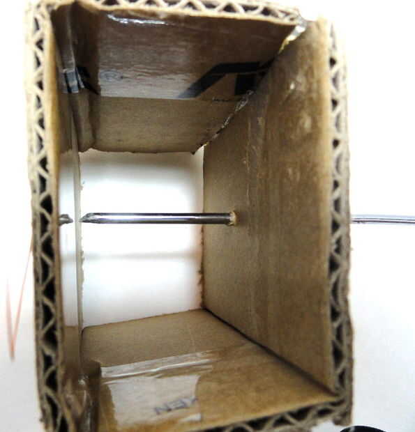 El siguiente paso es colocar los imanes a la barra. Esta parte puede ser un poco frustrante a veces dependiendo el diseño de la vivienda y la inserción de la varilla. Colocar un imán en la varilla en el centro de la caja, luego coloque el otro imán en el otro lado de la barra para que los dos imanes del emparedado la varilla. En un modelo utilizamos un poco de cuña de cartón en ambos lados de los imanes para hacer los imanes sentarse recto, pero esto no era necesario.