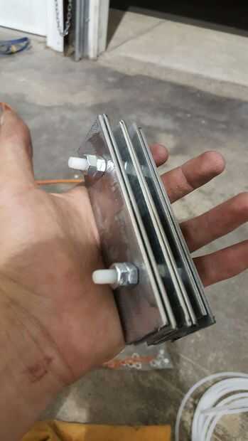 Tomar su longitudes de acero y cortar unos 5" piezas. Debe tener 14 de estas piezas. Tomar 1/4" Drillbit un taladro dos agujeros en cada pieza. Probar y hacer la línea de agujeros mejor como sea posible. Luego tomar la una placa de Nylon los pernos y deslice sobre los pernos. A partir de ahí entran en el patrón de la arandela de Nylon, placa, tuerca de acero, placa. En mi caso hice dos pequeños que funciona bastante bien, pero asegúrese de que el dos no lo toque si eliges mi ruta.