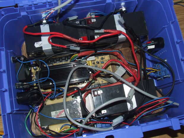 Todo el conjunto implicado varias operaciones de deshacer como tiene estrecho el espacio en lugares y tuve que montar algunas cosas y luego las encima de ellos. La última foto también muestra los conectores de la batería externa (dos tornillos de 8mm) se el el positivo y negativo del Banco de baterías. Ésos consiguieron dos espaciadores de plástico (uno rojo y otro negro) que indica la polaridad. También voy a poner una tapa de plástico para evitarlos cortocircuitos. Tener conectores externos es muy importante. Podría poner un regulador solar en eso y utilizar un panel solar para recargar el Banco. También podría empezar un coche ellos si muere la batería del coche. O sólo podría conectar las baterías adicionales para aumentar la capacidad de su banco.
