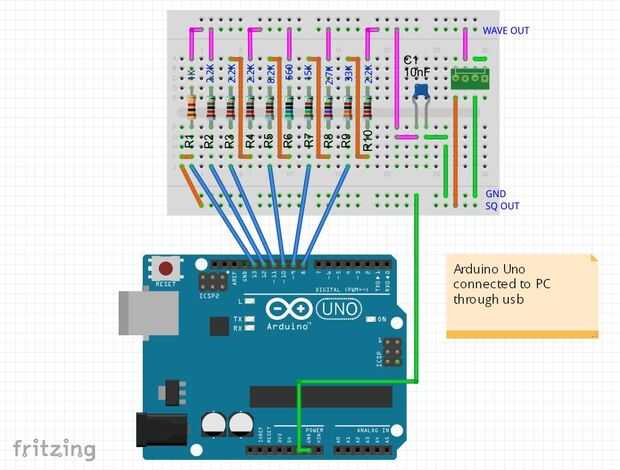 Se añade un condensador de 0.01 uF filtro a la salida DAC de resistencia para suavizar las formas de onda.