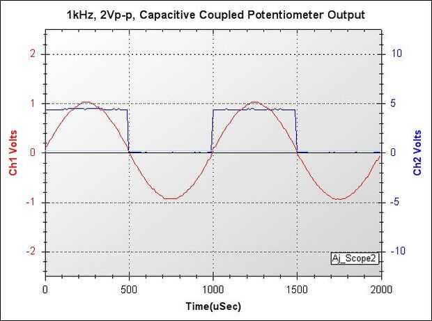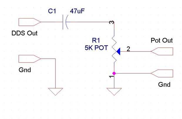 Esto se logra mediante un circuito externo donde la salida del generador DDS capacitively se acopla a un potenciómetro y la salida final tomado desde el punto de limpiaparabrisas de potenciómetro.