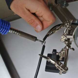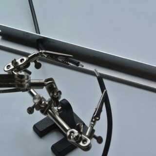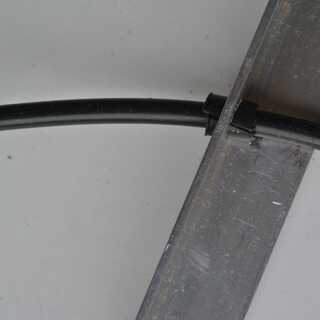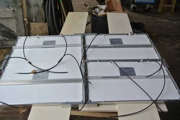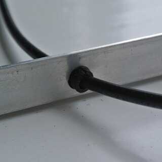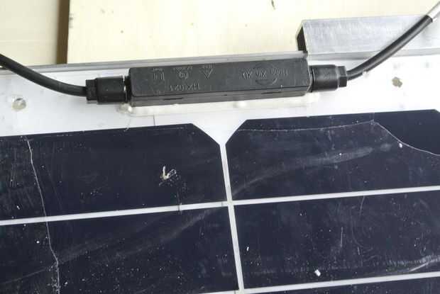 Los cables deben soldarse en serie como se puede ver en el esquema adjunto. Por lo que conectar el polo positivo de un panel con el polo negativo de la siguiente. Para ello tienes que poner los cables en algunos casos a través de los perfiles en el medio. Para que ellos no se exprimen los paneles plegados. Por lo tanto, taladre un orificio a través del perfil y pasar el cable. Proteger el cable y manténgalo en posición en el agujero con un pedazo pequeño de caucho. Aislar las conexiones soldadas con el calor tubos de reducción. Al final tienes que conectar el enchufe M4 en el positivo y el polo negativo, respectivamente.