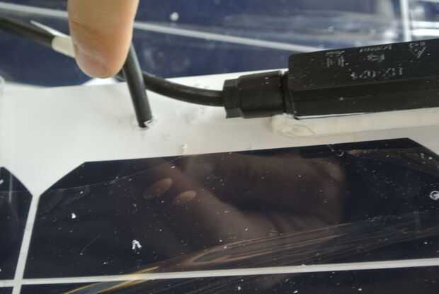 Después de que los módulos solares se conectan al mecanismo de plegado, los cables necesitan ser conectados y fijo. El primer paso es llevar los cables a la parte trasera de los paneles solares. Perfore agujeros como se puede ver cerca de la caja de conexión de los paneles. Luego empuje los cables hacia el otro lado.