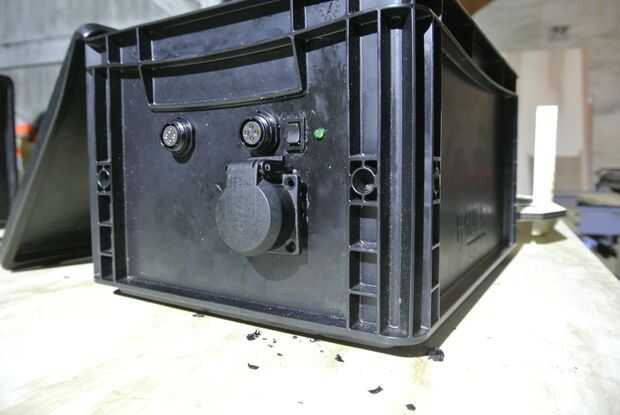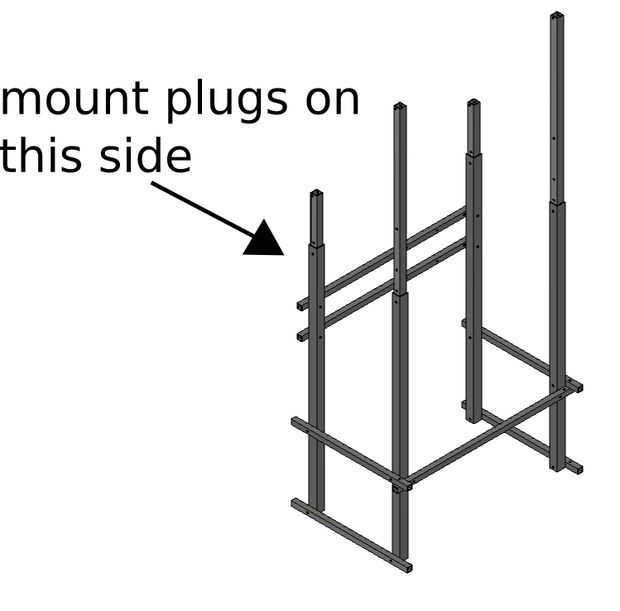 Todos estos componentes deben situados en el tercio superior de las cajas y centrados en la fachada. En el caso de la caja solar, deben centrarse horizontalmente en el lado más largo, donde perfiles horizontales de las dos de la estructura interna (como en el siguiente diagrama). Para la batería y zócalo/inversor-caja, debe ser horizontalmente centrados en uno de los lados más cortos.