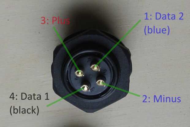 El orden de las diferentes clavijas de los enchufes y enchufes eléctricos se puede encontrar en foto siguiente. Conexión uno es para la 1ª comunicación (cable azul), dos es menos 3 es más y no 4 es la 2da comunicación (cable negro).