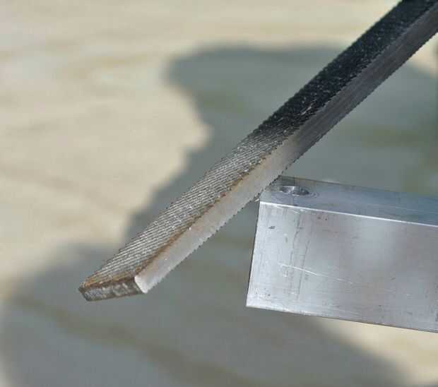 Consulte el PDF de lista de materiales arriba para una lista completa de aluminio requiere tamaños de perfil y formas (L, T o Plaza). Usted puede comprar perfiles aluminio precortado a los tamaños de la derecha. De lo contrario, tienes que cortarlas primero según la lista de material. Una vez que los tengas en la mano, el primer paso es presentar los extremos de los perfiles para quitar las rebabas, como se muestra en la siguiente imagen.