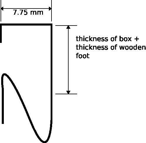 La altura de la "boca" del rayo doblado depende del grosor del madera pies (ver diagrama). Debe 2-4 mm menor que el espesor agregado de la caja y el pie de madera. Para doblar el rayo, a partir de un lado del rayo y uno tras otro de flexión manteniendo el habló con los alicates y luego doblando el extremo más largo del rayo con la mano en la forma que te gusta hacer.