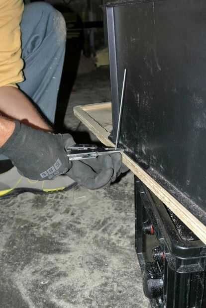 Después de moler la estructura del pie, colocar las cajas en sus lugares y haga 4 agujeros en el borde exterior de la parte inferior de cada caja y la estructura subyacente de la madera. Con estos agujeros, las diferentes partes están conectadas por un rayo de bicicleta doblada. La forma del rayo puede verse en la siguiente figura: