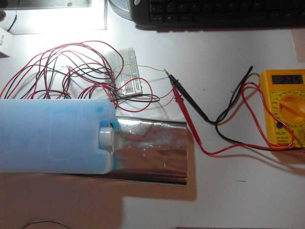 1. el primero consiste en colocar 8 placas Peltier en fila sobre un trozo de metal a modo de mesa. La parte en contacto con el metal es la encargada de recibir el calor (suministrado por una vela encendida). La parte superior irá en contacto con un foco frío, en este caso un bloque congelable. El resultado obtengo es la eficiencia es muy baja puesto ni el frio ni el calor están en contacto íntimo con la placa y el sistema, muy ineficiente, producir muchas pérdidas.
