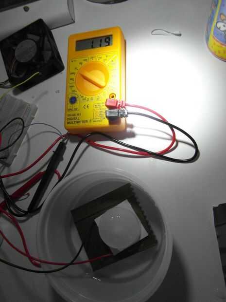 3. el tercer y último experimento. Con este experimento trato de averiguar cuantas placas me harian falta para producir un voltaje de al menos 5 v en el caso de la máquina vamos a construir fuera bastante más eficiente los sistemas anteriores. Inicialmente coloco 1 placa sobre un disipador de aluminio y los introduzco dentro de un recipiente con agua caliente (60 º c).