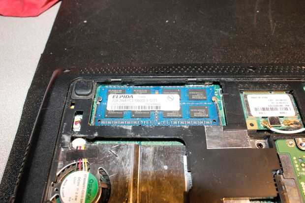 Para quitar el RAM accione los cierres a cada lado hacia afuera para liberar el módulo de memoria RAM. Esta máquina soporta un máximo de 2 Giga de ram. Que no conozco de allí es ninguna actualización del BIOS que apoyaría un módulo de memoria más grande. Para instalar el RAM módulo Inserte el módulo en el socket a un ángulo y luego empuje hacia abajo hasta que encaje en la placa base. Esto no debe tomar un montón de presión a instalar. Si están cumpliendo con resistencia de copia de seguridad y vuelva a intentarlo. Una vez que el reverso del módulo instalado de este paso; seguir procedimientos de instalación de puerta en el siguiente paso. No olvide probar el teclado antes de bloqueo hacia abajo.