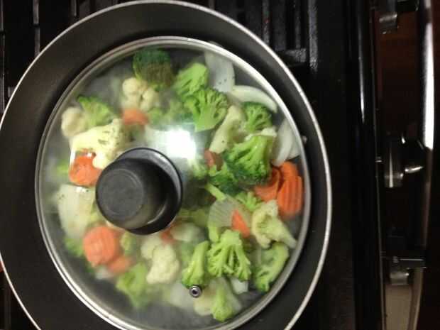 Añadir verduras mixtas mezcla en el aceite permitiendo para cubrir uniformemente las verduras. Cubrir durante 2 minutos. Comience a mezclar verduras nuevamente, asegurándose de que ninguna pega para pan. Después de 4 a 5 minutos añadir condimento de ajo, sal y pimienta. Apague la verduras y reservar.