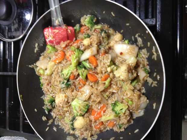 Tomar arroz cocido, escurrir y mezclar con verduras en Wok. Verter la salsa de la General Tso sobre arroz y verduras y mezclar. Servir de inmediato.