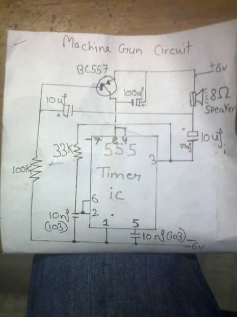 También puede pe por 6 a 9 voltios. Generará un tono similar al sonido de la ametralladora. En este paso se da el esquema.