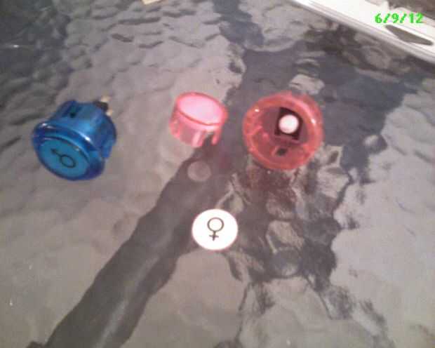Luego desmontar los botones. Mina tenía pestañas poco a exprimido y la parte superior del botón se cayó hacia fuera. Los emblemas masculinos y femeninos en los gráficos en el interior de los botones y luego poner los botones detrás juntos otra vez.