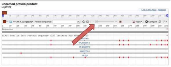 Usted puede acercar y alejar para ver la secuencia real y mover la vista arriba y abajo de la proteína. Esto es útil en la búsqueda de dominios conservados a través de las diferentes especies.