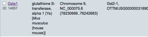 El gen utilizado para la duración de las instrucciones y por lo tanto en todas las fotografías es Gsta1.  Simplemente haga clic en el nombre del gen (color morado en la foto pero será azul en el sitio web) que se elige para llegar al siguiente paso.