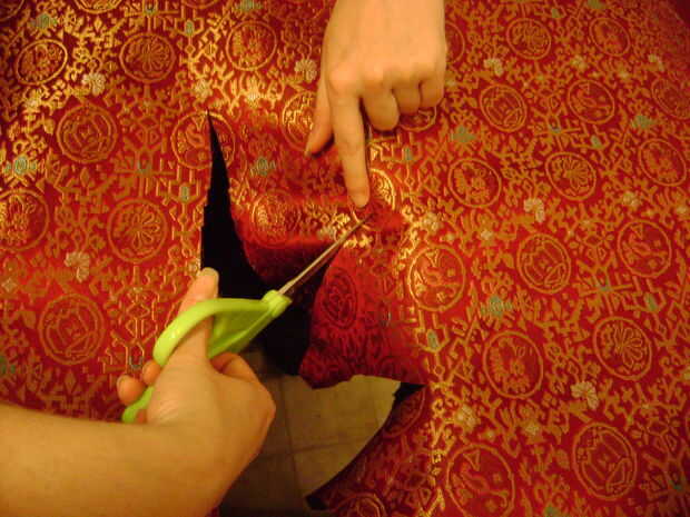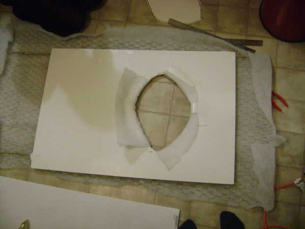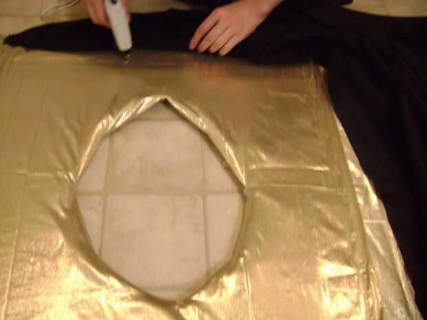 Coloque a la tela de la alfombra con pegamento caliente alrededor de los bordes. Para asegurarse es liso e incluso, trabajo en secciones y después pegar abajo de una sección, hacia el lado opuesto. Corte a través del centro del orificio y fije las aletas al interior.