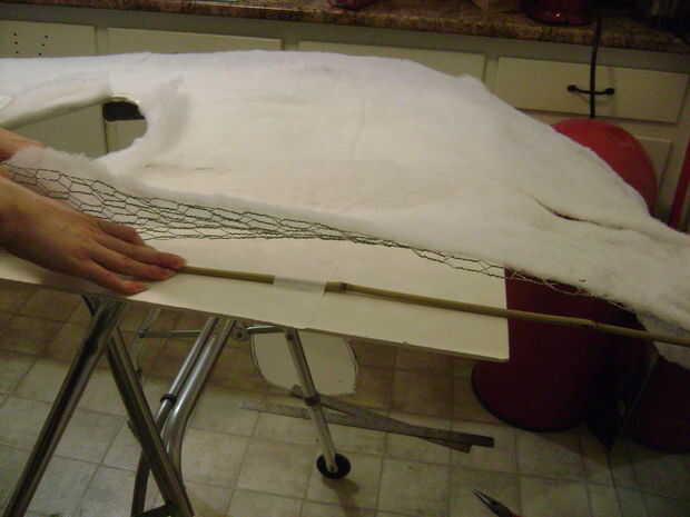 Cortar un trozo de guata un poco más grande que el alambre de pollo. Coloque la base de la espuma en el bateo y el pollo. Si el alambre de pollo se inclina hacia abajo más allá de los extremos de la base de la espuma, coloque dos postes de bambú para sostenerlo para arriba. Corte a través del centro del agujero. Doblar los bordes del alambre de pollo y bateo hacia abajo y asegure a la base de la espuma con cinta adhesiva y pegamento caliente.