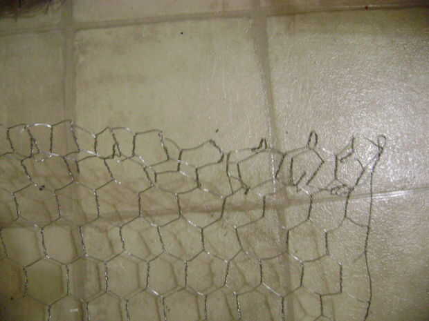 Cortar un trozo de alambre de pollo ligeramente más grande que el tejido de alfombras. Asegúrese de que esté lo suficientemente estrecha para caber a través de las puertas. Utilizando sus pinzas, doble los extremos puntiagudos de lo alambre de pollo por lo que la pieza final es ligeramente más pequeña que su tela. Es una buena idea usar guantes de trabajo para esta parte para no cortarse con los bordes agudos.