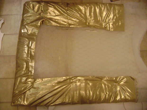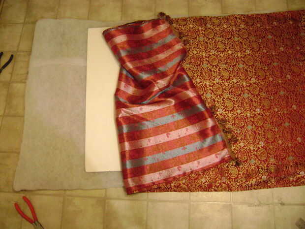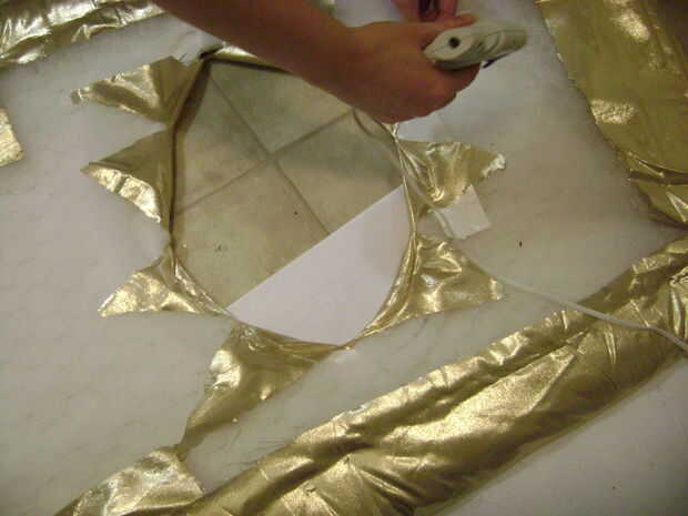 Cubrir la parte inferior (lado de núcleo de espuma) con la tela del forro. Doblar los bordes como si estás envolviendo un regalo y fijar con pegamento caliente. Corte a través del centro del orificio y coloque las aletas hacia el lado opuesto con pegamento caliente.