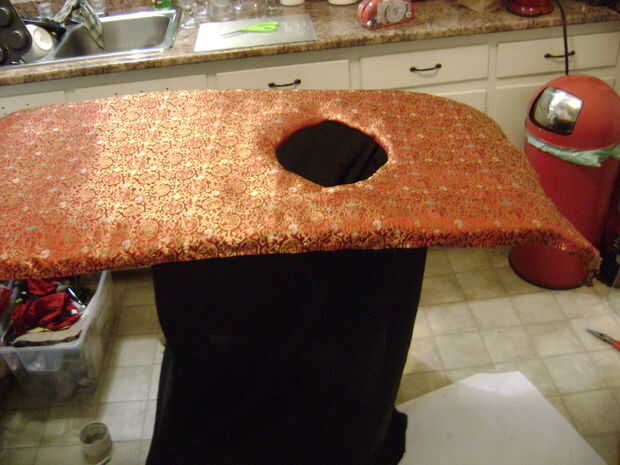 Cortar un trozo de tela lo suficientemente grande para ser una falda alrededor de la walker y ocultar las piernas del portador de traje. Pegar la falda en la parte inferior de la alfombra pero dejar abierto en la espalda por lo que es fácil de rastrear dentro y fuera.