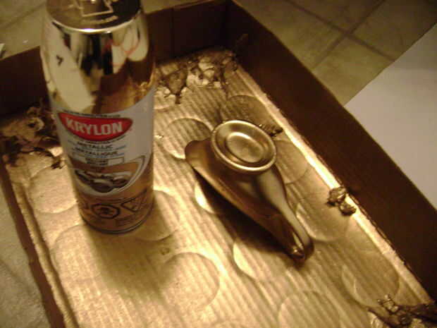 El oro de salsera para hacer una lámpara mágica para el genio de la pintura de aerosol. Conéctelo a la alfombra con pegamento.