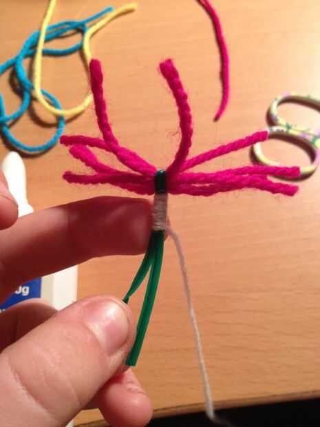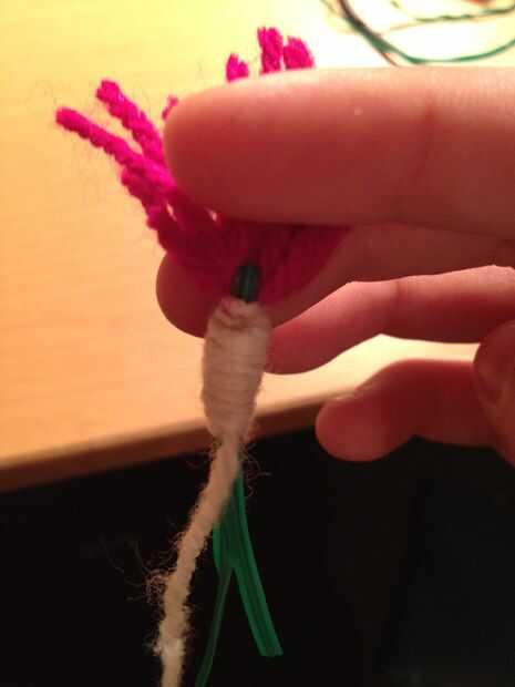 poner el extremo de los lana entre los dos cables y luego envolver alrededor de ellos, formar la cabeza. Cuando haya terminado de hilo la lana sobre la aguja y asegure el extremo (ver figura 4 y 5 de este paso). Corte el exceso de lana.
