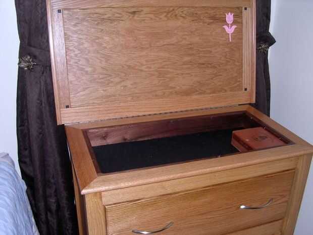 He coloca siempre elementos en mi aparador y francamente me impulsa frutos secos porque la materia es siempre hacia fuera. Agregar la tapa a este aparador era una solución perfecta y no se considera cerrada. está hecho con madera de nogal con un fondo de piel grabado que pegué a un más fino 1/4" placa de respaldo. ENCANTA la forma en leva hacia fuera y estoy seguro quedarán muchos años más!