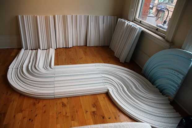 Después de varios ensayos y errores de inicialmente tratando de hacer un molde de madera y la perforación con cable de piano a través de la madera CNC fresado encofrado, nuestro equipo utiliza plástico de caderas para negativos de forma para colocarse en el encofrado de madera. Al darse cuenta que los negativos de plástico HIPS no produjo las definiciones precisas que nos gustaría lograr a través de los amplios detalles de la CNC fresado grosores de línea, nuestro equipo de ambiente en la producción de la producción final a través de la espuma EPS donada desde el sitio de construcción.