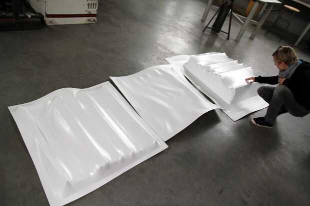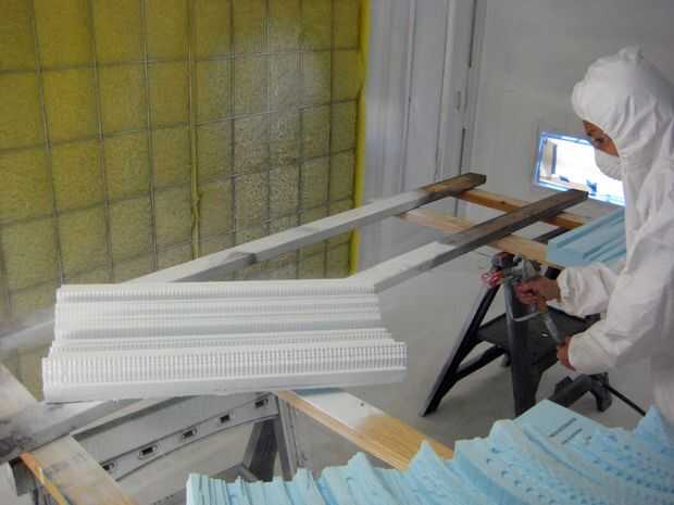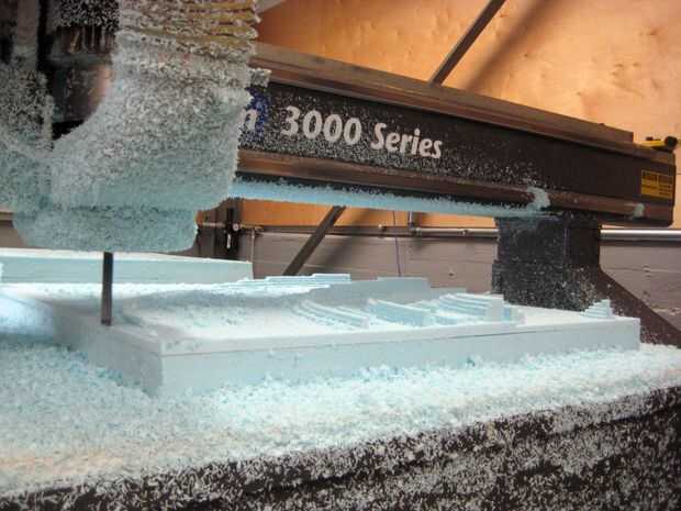 La espuma de densidad media EPS molida permitió más precisión CNC molido encofrado, pero eran más voluminosa a la nave. Y requiere acabado adicional, como la aerografía toda la instalación con un pincel de aire a presión. El acabado final de la instalación fue 2 galones de pintura acrílica de hornos. El tiempo de producción total de la instalación fue 3 días de molienda y un día de trabajos de pintura, además de un 1 día adicional para finalizar el lecho de secado de las piezas.
