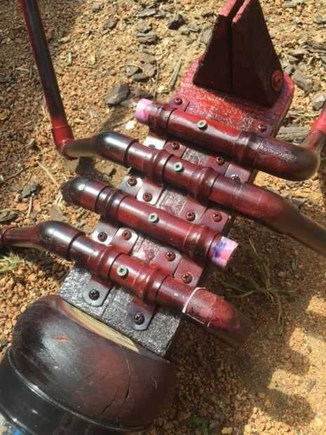 Las piernas fueron hechas de tubo de PVC. Cada pata se hizo de tres piezas conectadas por una combinación de 135 grados y una combinación de 90 grados. Cada par fue conectado por una pieza central de la tubería. Usé a 135 grados se une a conectar cada pata a las piezas centrales. Entonces se unieron las patas al cuerpo con soportes de metal, también de atornillado a través de la actual tubería de PVC en el cuerpo para la fuerza agregada.