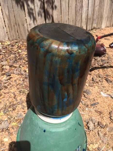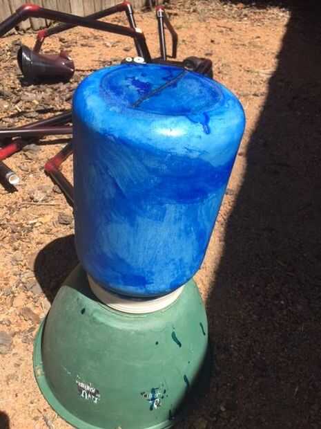 El depósito de proteína era blanco, así que tuve que pintarlo de negro. Para dar la pintura agrega tracción a pegarse demasiado cubierto el recipiente con pantimedias que primero pegan con cemento de PVC y luego pintado con tinta para madera nogal para llevar el color azul. Cuando se seco que aerosol pintado negro con detalles en rojo.