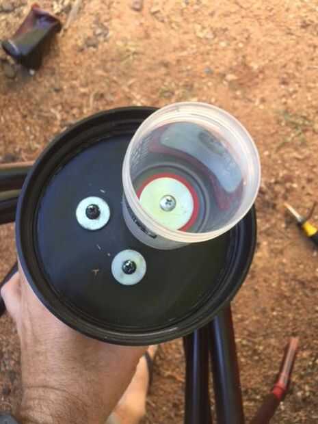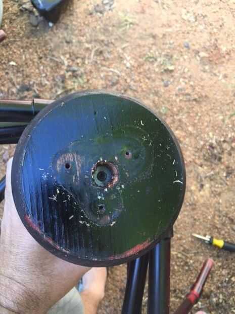 Darle a la araña añadido forma primero añadí un disco de madera para el cuerpo. Compré esto en una tienda de chatarra de 50cents pero he visto en ferreterías a unos $5. Esto fue atornillado en su lugar primero con un tornillo largo en el medio. Luego até la tapa del contenedor de proteína para el disco de madera con tres tornillos. Uno de estos tornillos también pasó por el fondo del frasco para mantenerlo lugar.