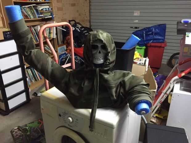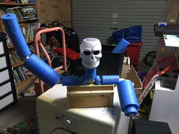 Quería tener una idea de la cabeza así que compré un cubo de transporte $2 Halloween para recoger dulces. He quitado el mango y había perforado un agujero en la parte inferior del mismo tamaño que el tubo de PVC, así que pude mantener el cráneo en su lugar colocando sobre el tubo. Corté otra pieza de los tallarines de la piscina como el cuello.