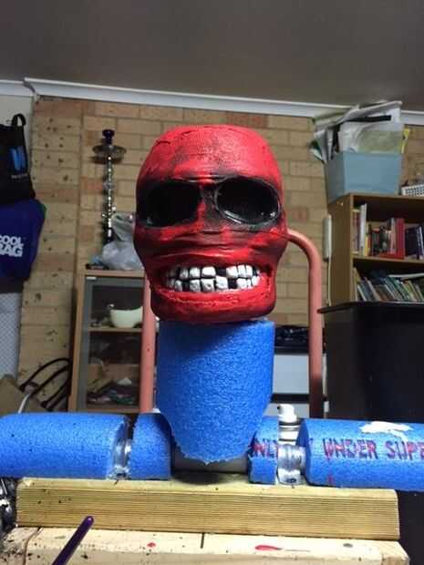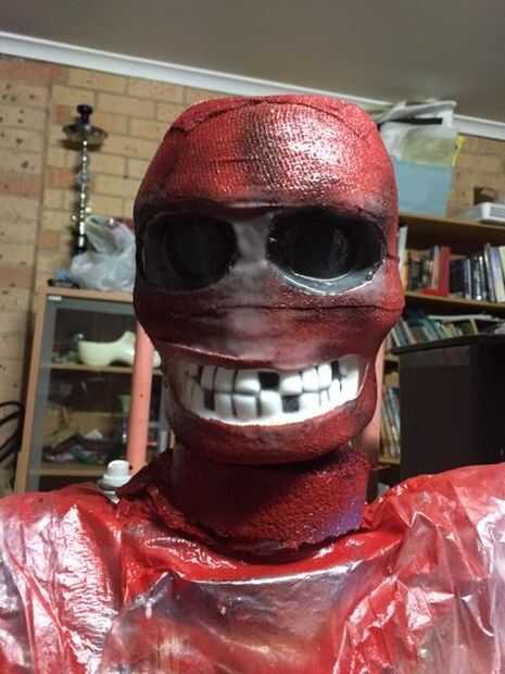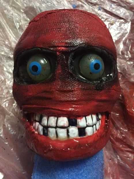 Entonces aerosol pintado toda la cabeza con un poco de detalles de pintura en aerosol negro. Luego recorta los ojos y la boca y le dio un segundo spray con goma.