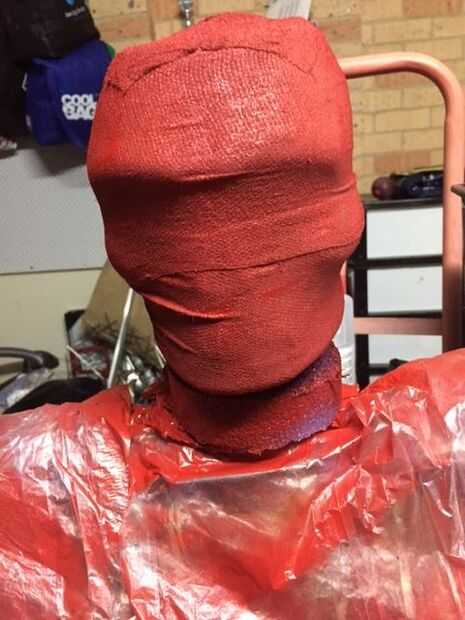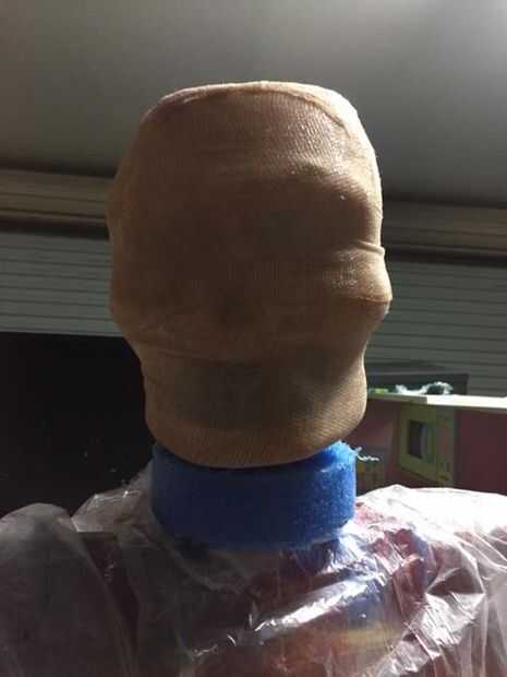 Primero envuelve el cráneo en vendaje para la piel. Entonces roció la cabeza con goma en spray. Puse cinta sobre los ojos y la boca como no quería que el vendaje se adhiera allí.